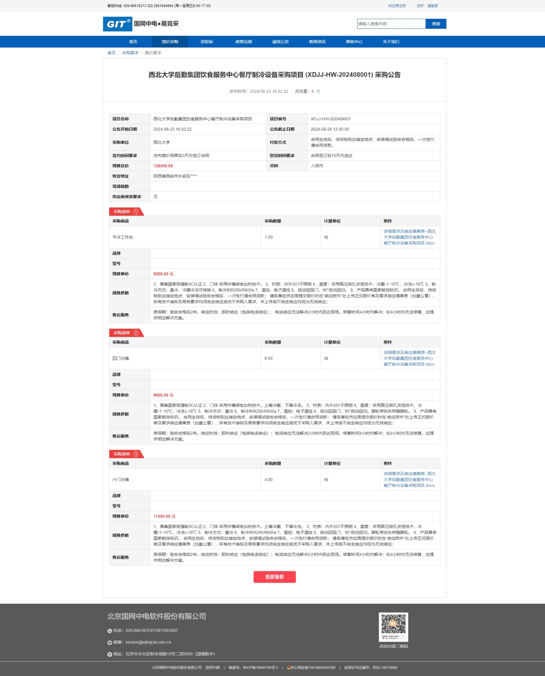 乐动网页版登录入口后勤集团饮食服务中心餐厅制冷设备采购项目 (XDJJ-HW-202408001) 竞价公告 作者: 编辑:采购与招标办公室 时间:2024-08-23 原公告链接:https://www.ejingcai.com.cn/site/bidding/detail/12189