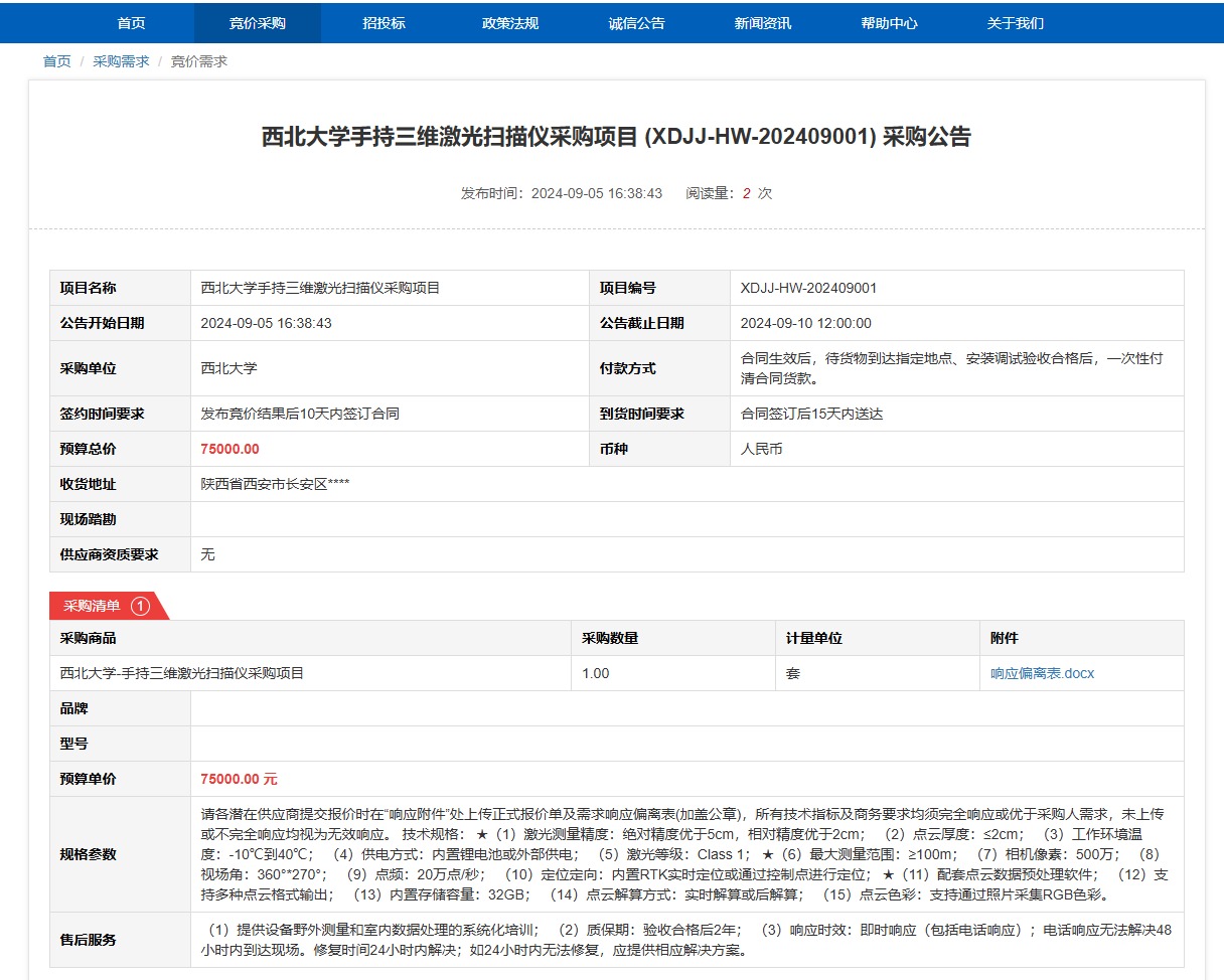 乐动网页版登录入口手持三维激光扫描仪采购项目 (XDJJ-HW-202409001) 竞价采购公告 作者: 编辑: 时间:2024-09-05 原公告链接:https://www.ejingcai.com.cn/site/bidding/detail/12357