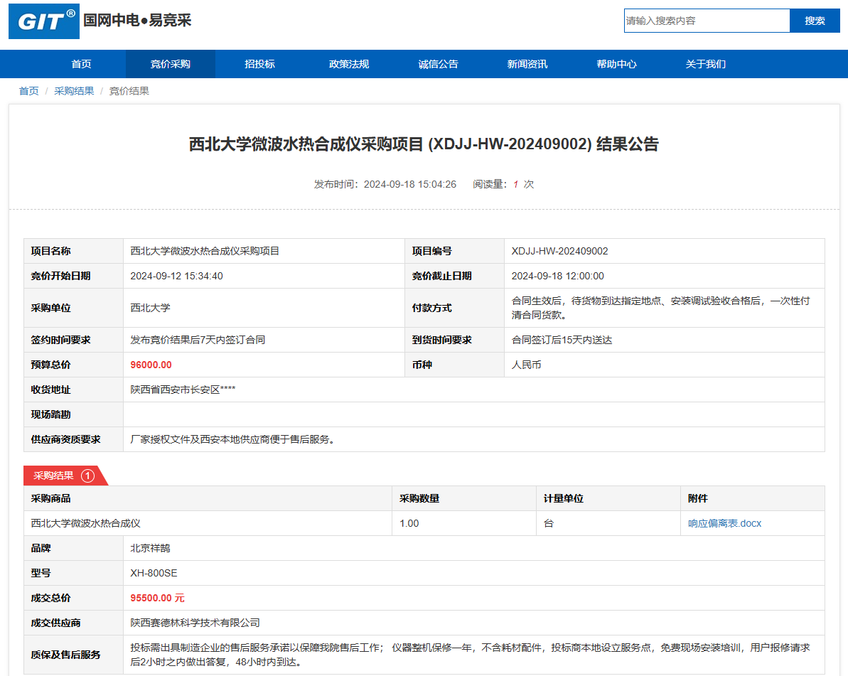 乐动网页版登录入口微波水热合成仪采购项目 (XDJJ-HW-202409002)竞价结果公告 作者: 编辑: 时间:2024-09-18 原公告链接:https://www.ejingcai.com.cn/site/bidding/detail/12667