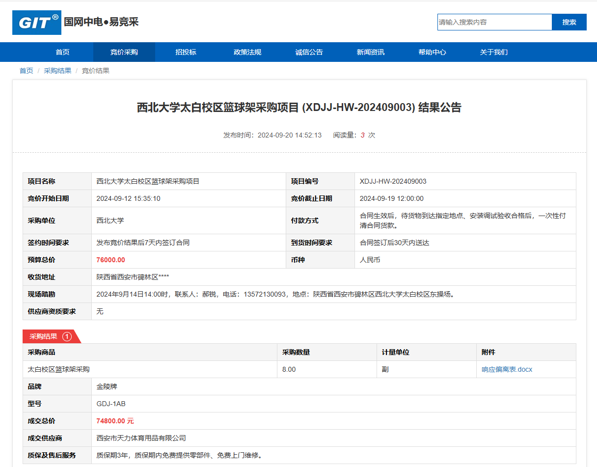 乐动网页版登录入口太白校区篮球架采购项目 (XDJJ-HW-202409003)竞价结果公告 作者: 编辑: 时间:2024-09-20 原公告链接:https://www.ejingcai.com.cn/site/bidding/detail/12756