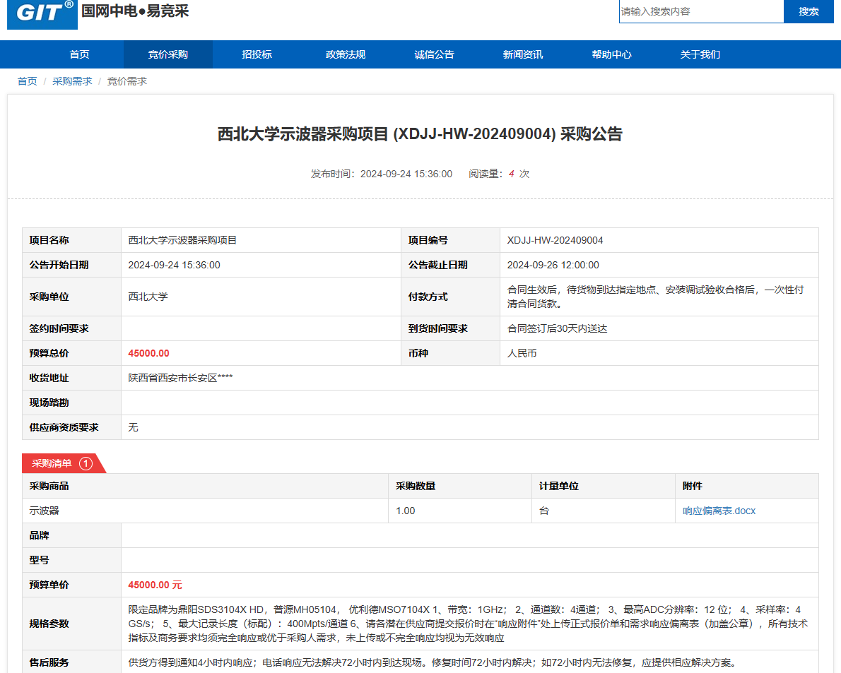 乐动网页版登录入口示波器采购项目 (XDJJ-HW-202409004)竞价采购公告 作者: 编辑: 时间:2024-09-24 原公告链接:https://www.ejingcai.com.cn/site/bidding/detail/12860