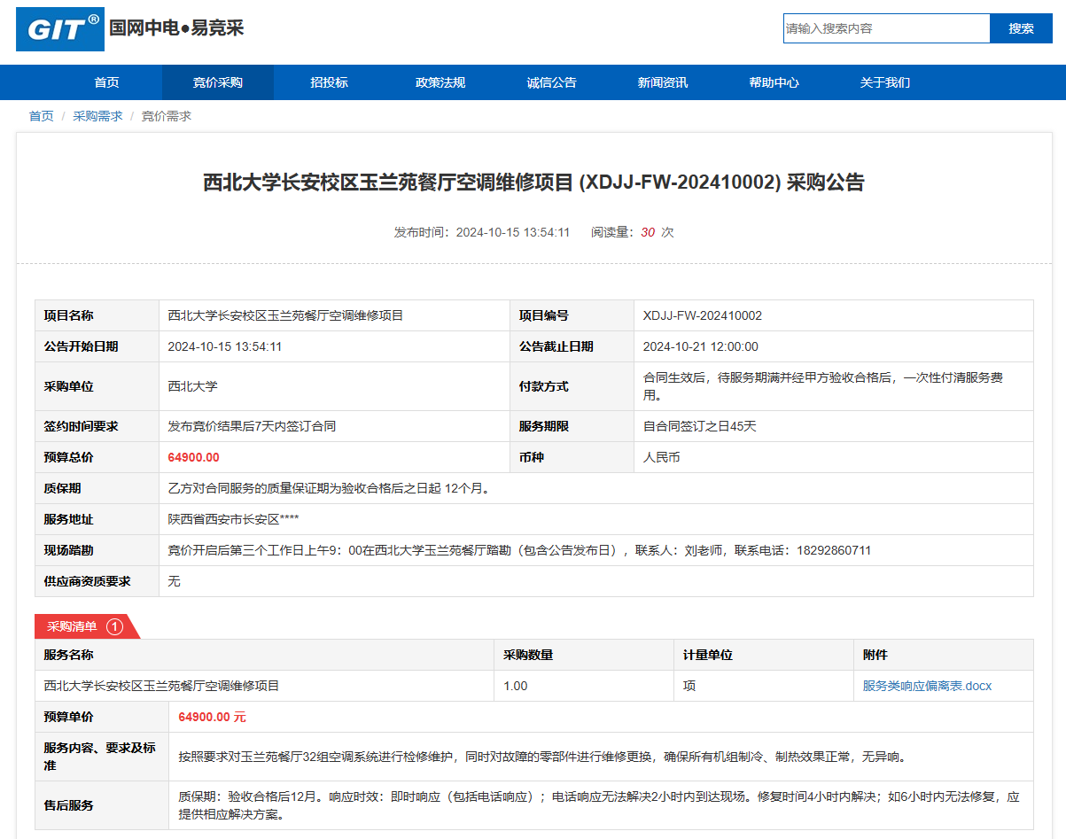 乐动网页版登录入口长安校区玉兰苑餐厅空调维修项目(XDJJ-FW-202410002)竞价采购公告 作者:采购与招标办公室 编辑: 时间:2024-10-15 原公告链接:https://www.ejingcai.com.cn/site/bidding/detail/13316