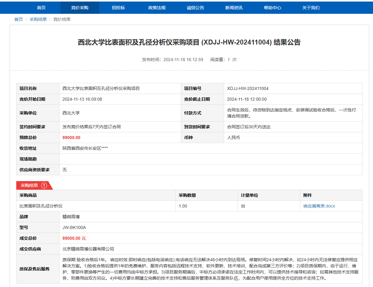 乐动网页版登录入口比表面积及孔径分析仪采购项目(XDJJ-HW-202411004)竞价结果公告 作者:采购与招标办公室 编辑: 时间:2024-11-18 原公告链接:https://www.ejingcai.com.cn/site/bidding/detail/15036