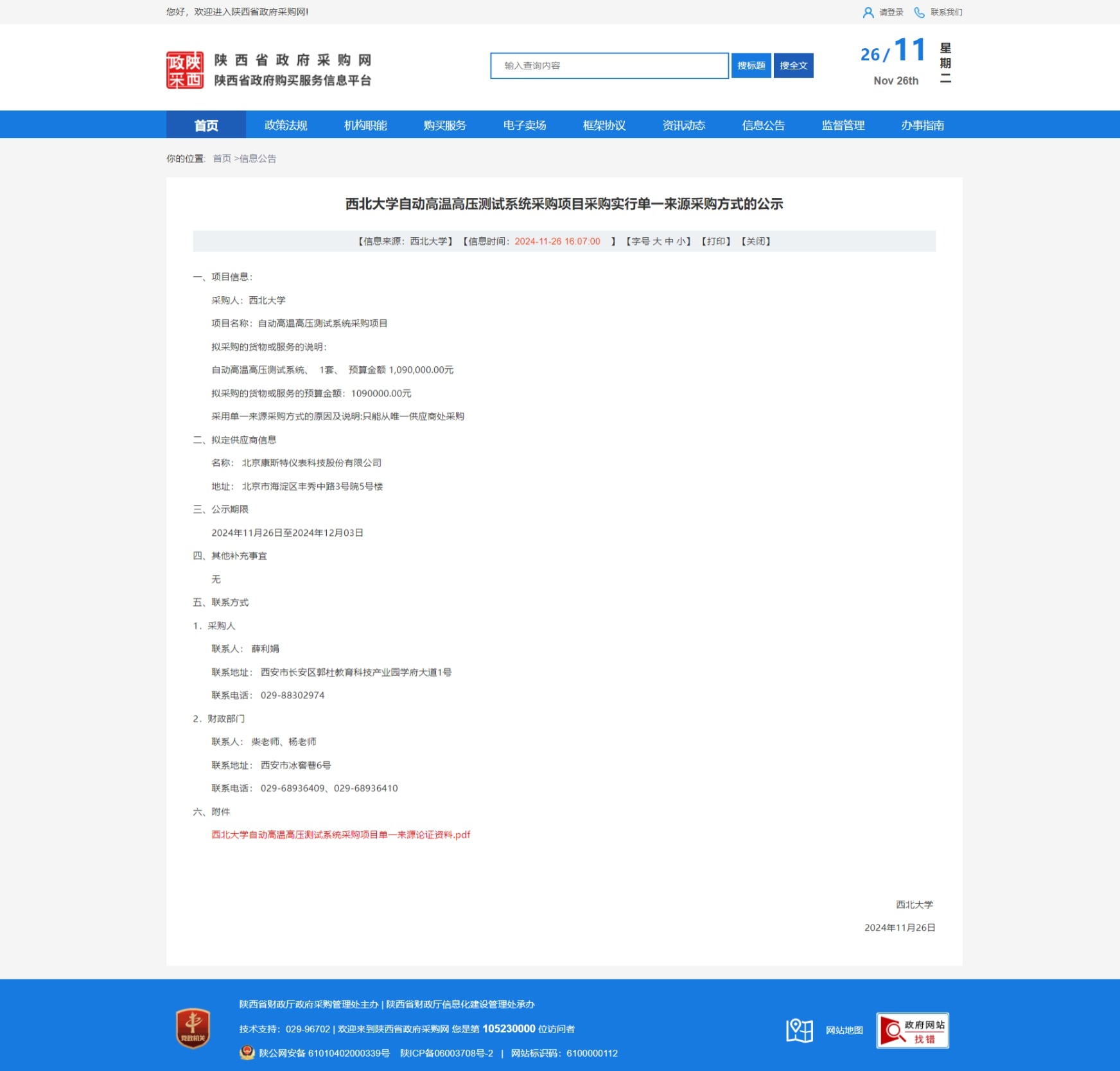 乐动网页版登录入口自动高温高压测试系统采购项目采购实行单一来源采购方式的公示 作者: 编辑:薛利娟 时间:2024-11-26 原公告链接:https://www.ccgp-shaanxi.gov.cn/freecms/site/shaanxi/ggxx/info/2024/8a69c037936597080193677af75243c5.html?noticeType=001051¬iceId=008eb2b0-abcf-11ef-8063-08c0eb20c666