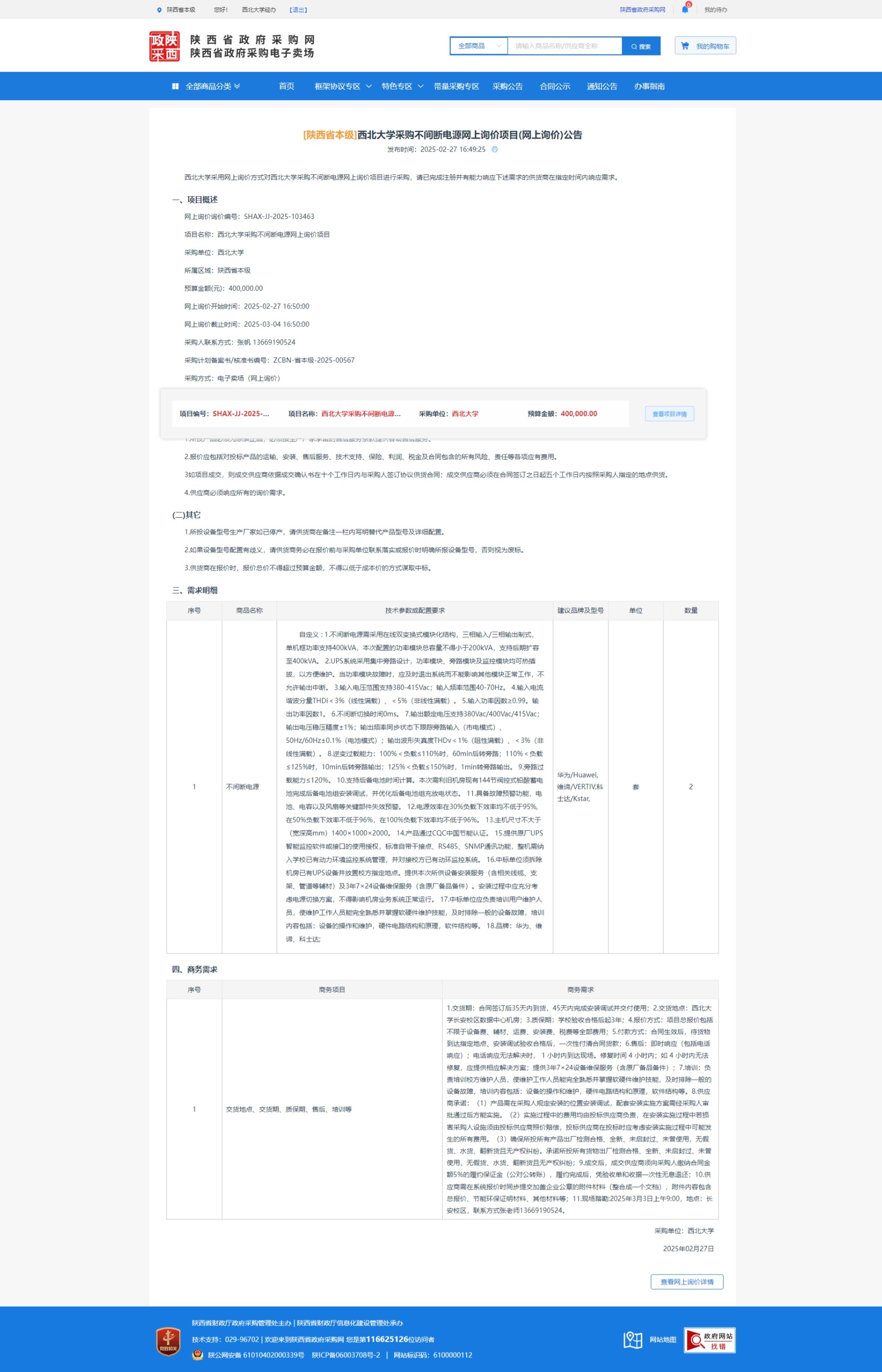 乐动网页版登录入口采购不间断电源网上询价项目(网上询价)公告 作者: 编辑: 时间:2025-02-27 原公告链接:https://www.ccgp-shaanxi.gov.cn/gpmall-main-web/basic/noticeDetail?noticeGuid=7294181247151177728