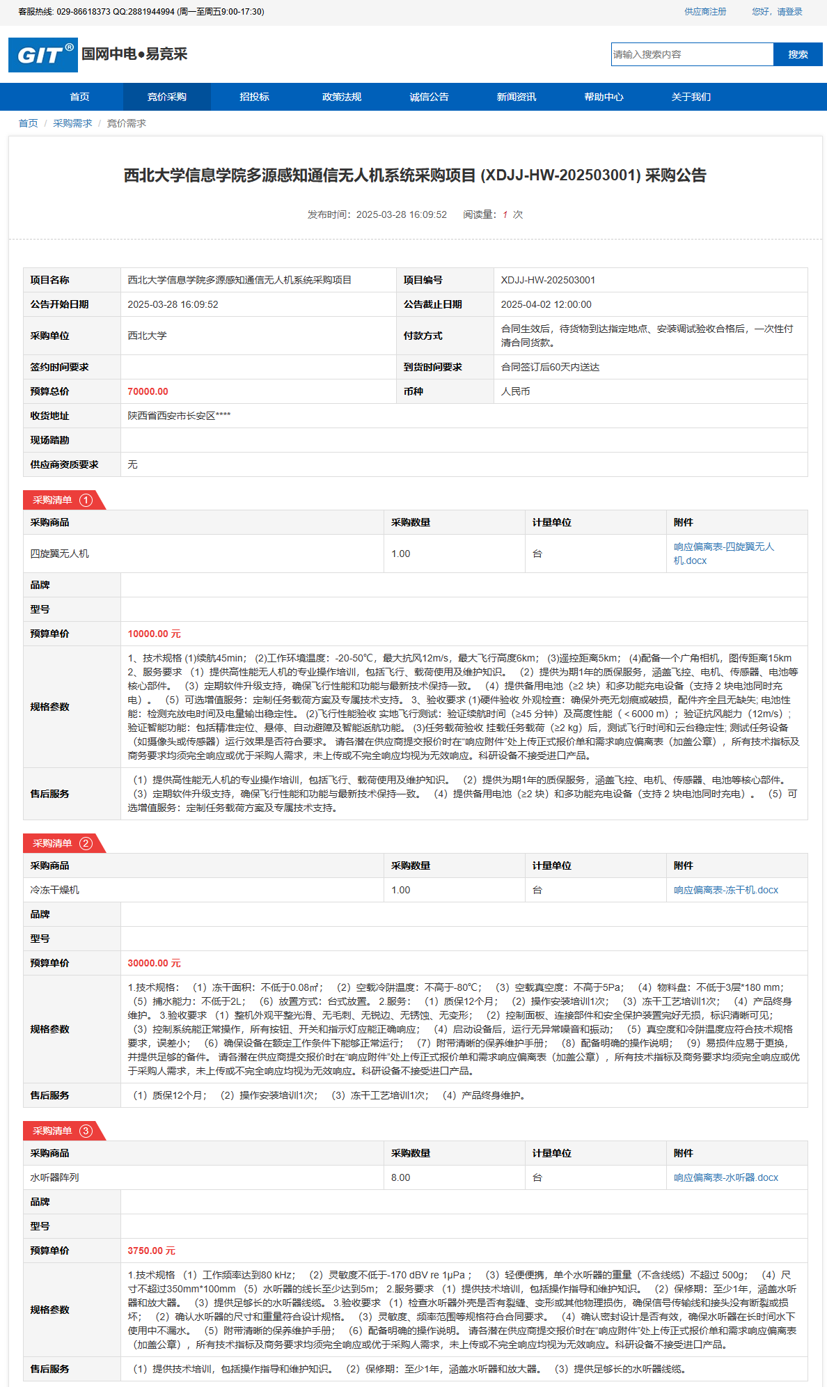 乐动网页版登录入口信息学院多源感知通信无人机系统采购项目(XDJJ-HW-202503001)竞价采购公告 作者:采购与招标办公室 编辑: 时间:2025-03-28 原公告链接:https://www.ejingcai.com.cn/site/bidding/detail/17255