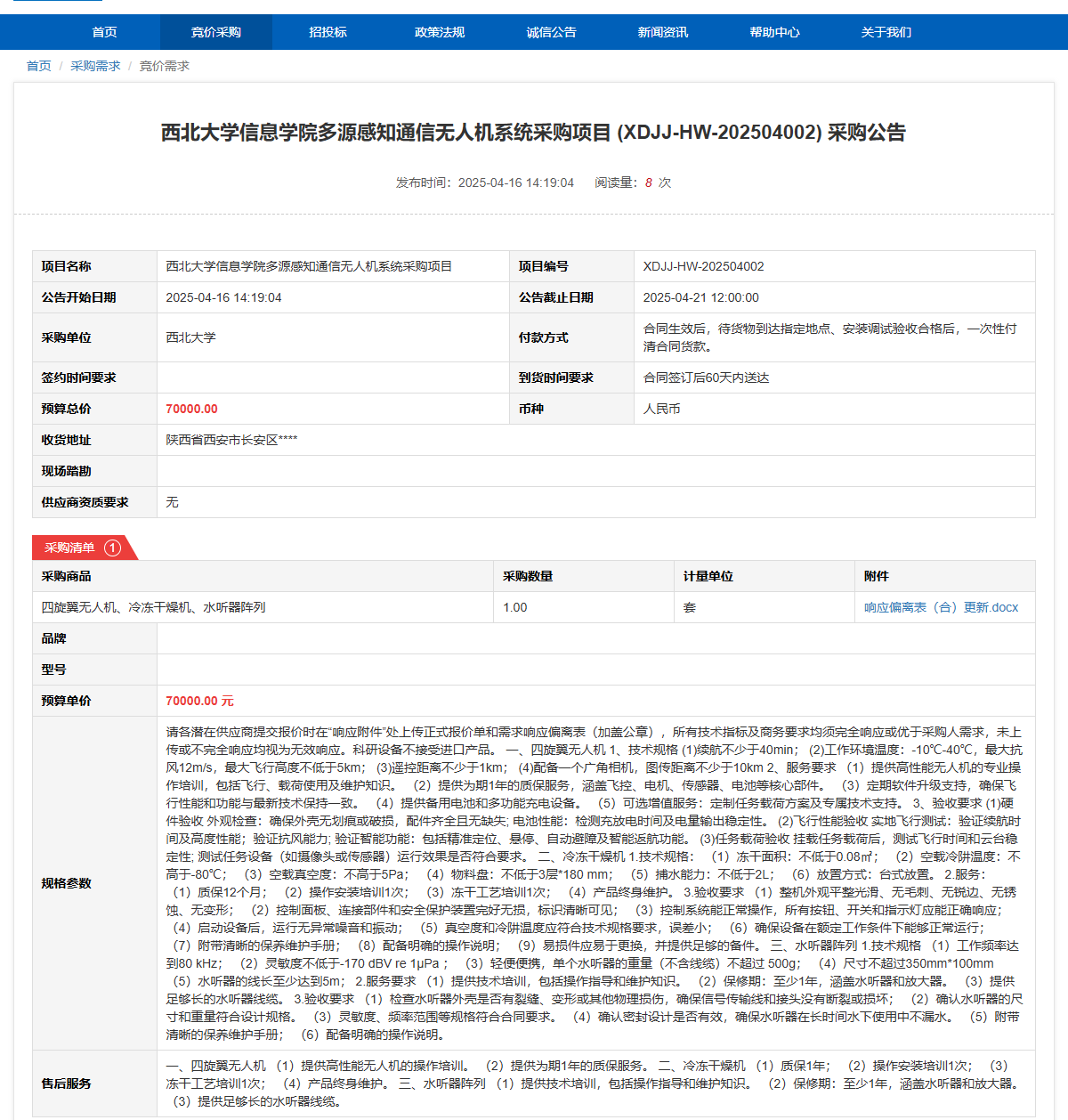 乐动网页版登录入口信息学院多源感知通信无人机系统采购项目(XDJJ-HW-202504002)竞价采购公告 作者:采购与招标办公室 编辑: 时间:2025-04-16 原公告链接:https://www.ejingcai.com.cn/site/bidding/detail/17703