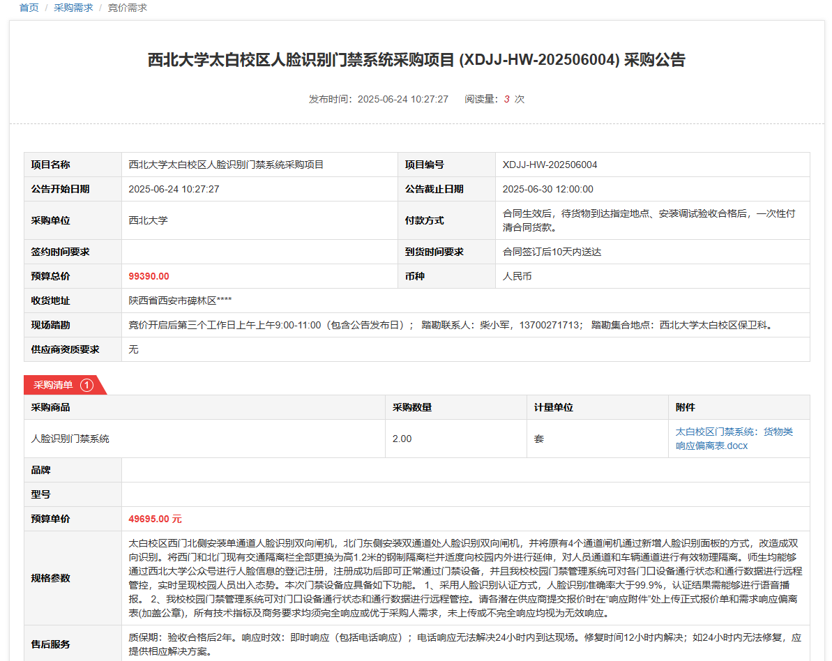 乐动网页版登录入口太白校区人脸识别门禁系统采购项目(XDJJ-HW-202506004)竞价采购公告 作者: 编辑: 时间:2025-06-24 原公告链接:https://www.ejingcai.com.cn/site/bidding/detail/19128
