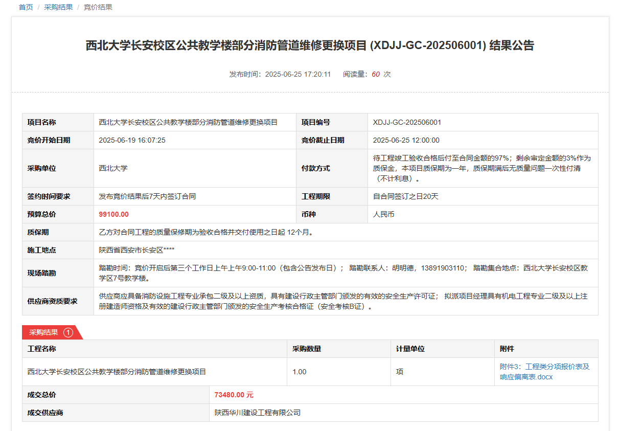 乐动网页版登录入口长安校区公共教学楼部分消防管道维修更换项目(XDJJ-GC-202506001)竞价结果公告 作者:采购与招标办公室 编辑: 时间:2025-06-25 原公告链接:https://www.ejingcai.com.cn/site/bidding/detail/19191