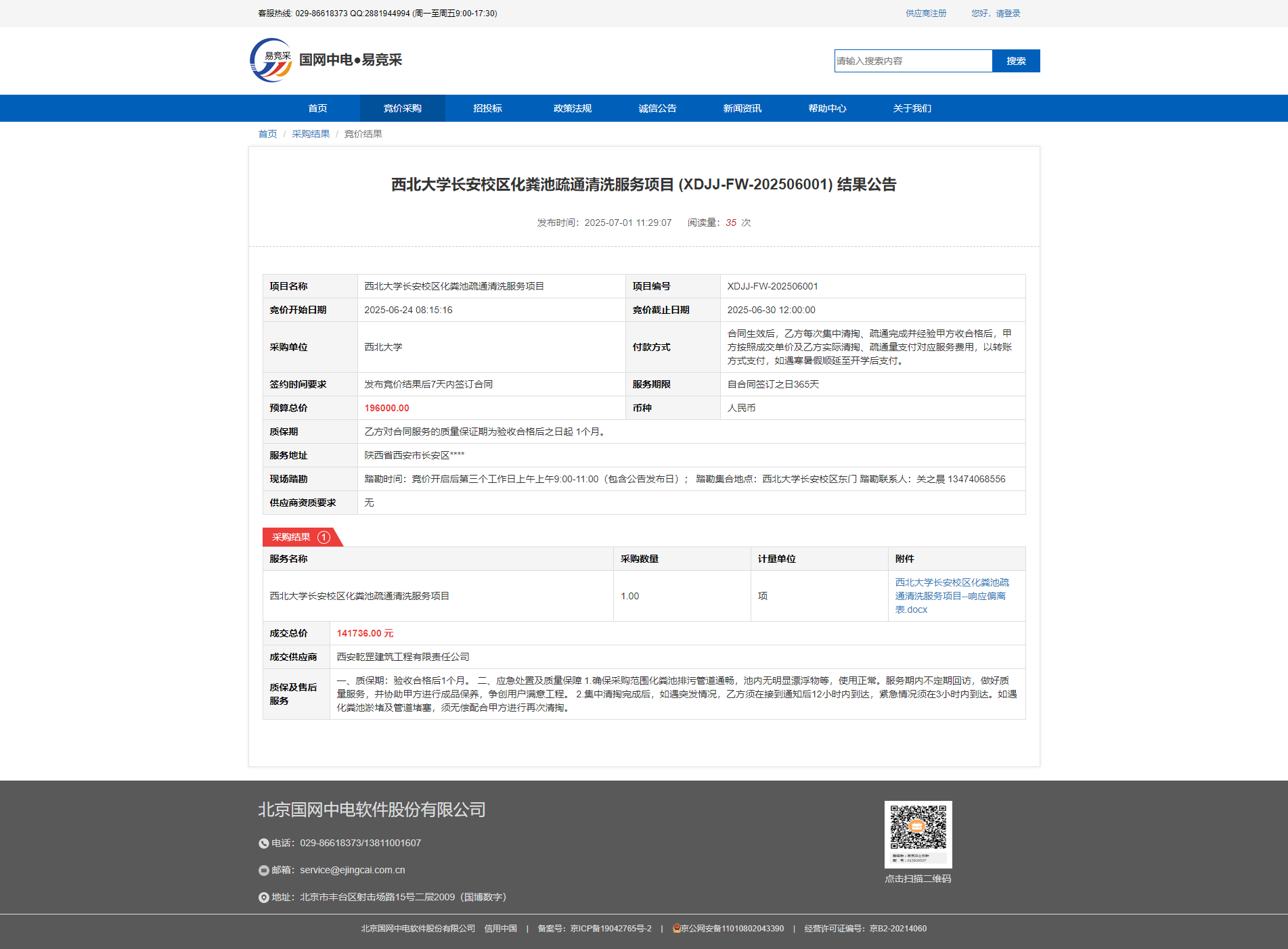 乐动网页版登录入口长安校区化粪池疏通清洗服务项目 (XDJJ-FW-202506001) 结果公告