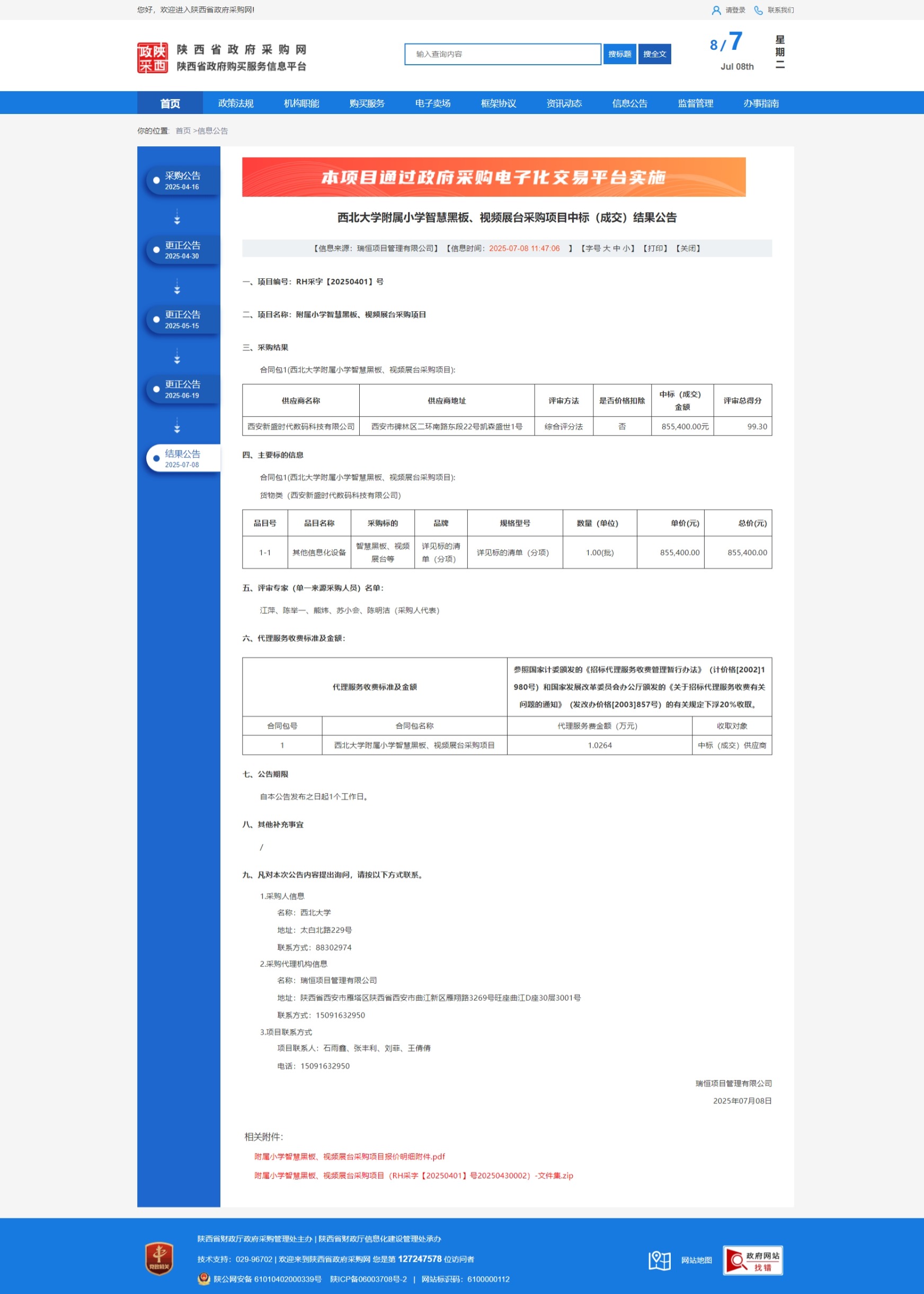 乐动网页版登录入口附属小学智慧黑板、视频展台采购项目中标(成交)结果公告 作者: 编辑:采购与招标办公室 时间:2025-07-08 原公告链接:https://www.ccgp-shaanxi.gov.cn/freecms/site/shaanxi/ggxx/info/2025/8a69c0bc97db81390197e819c3dd4789.html?noticeType=001021¬iceId=37da8661-5bb0-11f0-8063-08c0eb20c666