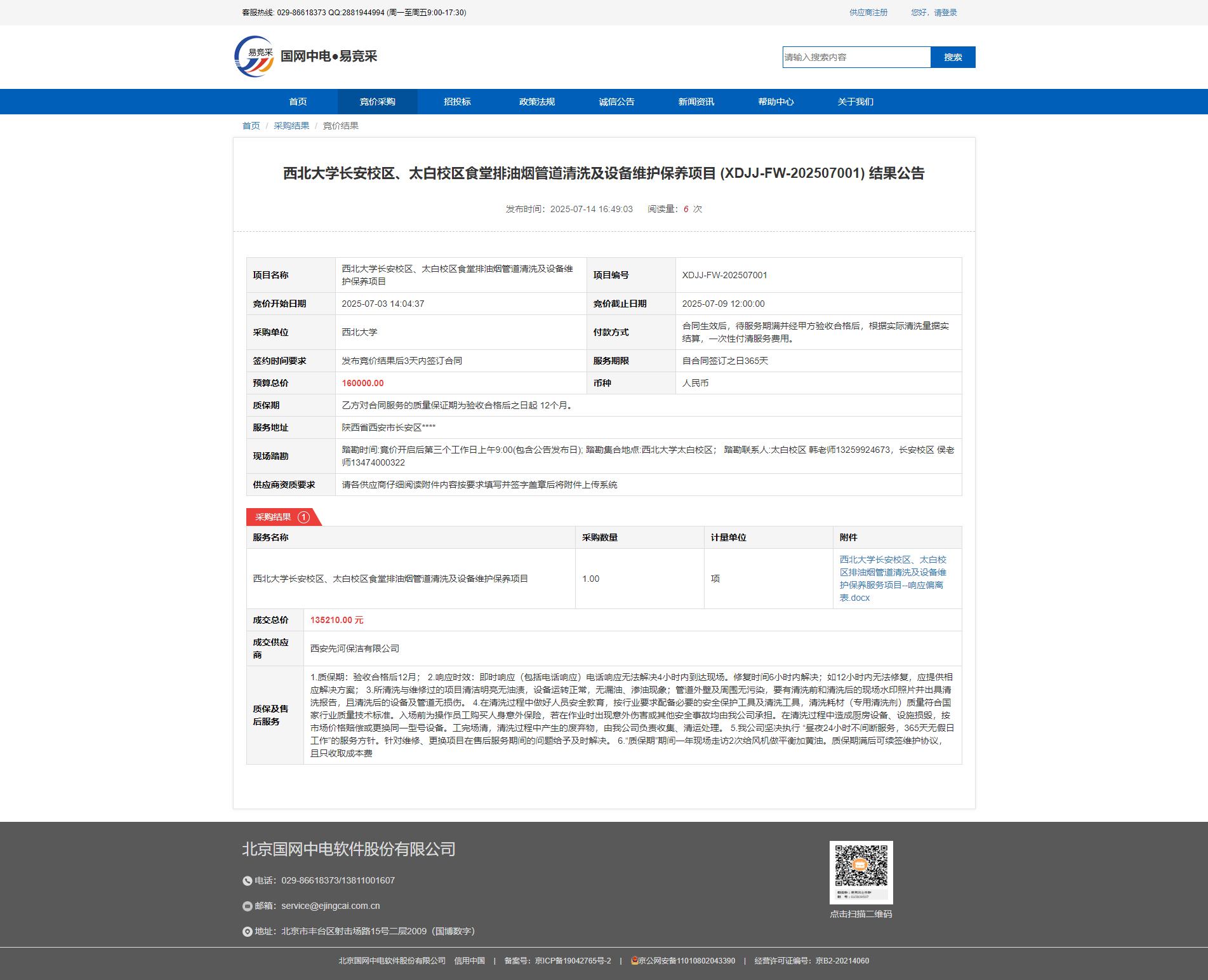 乐动网页版登录入口长安校区、太白校区食堂排油烟管道清洗及设备维护保养项目 (XDJJ-FW-202507001) 结果公告