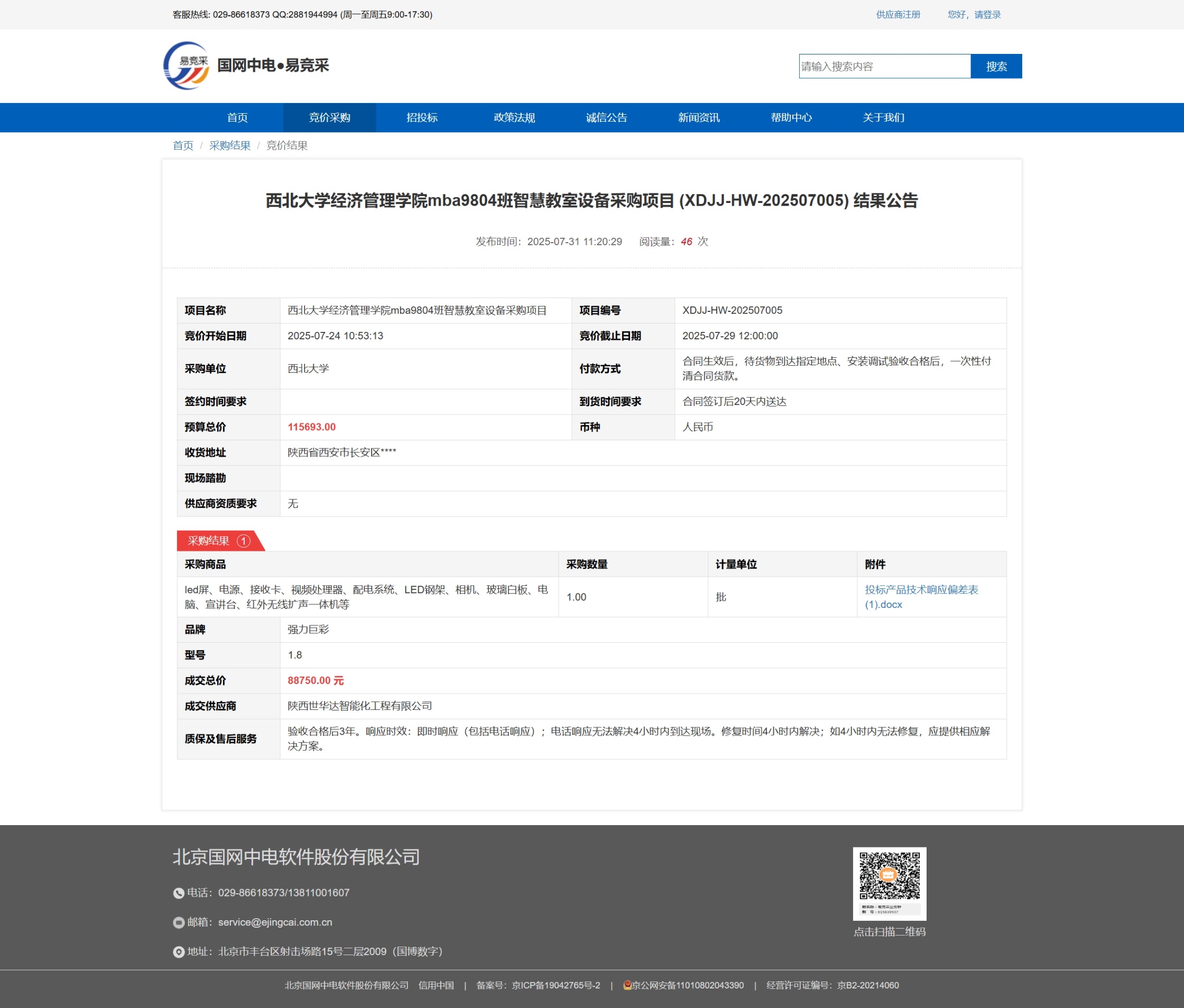 乐动网页版登录入口经济管理学院mba9804班智慧教室设备采购项目 (XDJJ-HW-202507005) 竞价结果公告 作者: 编辑:采购与招标办公室 时间:2025-07-31 原公告链接:https://www.ejingcai.com.cn/site/bidding/detail/19832