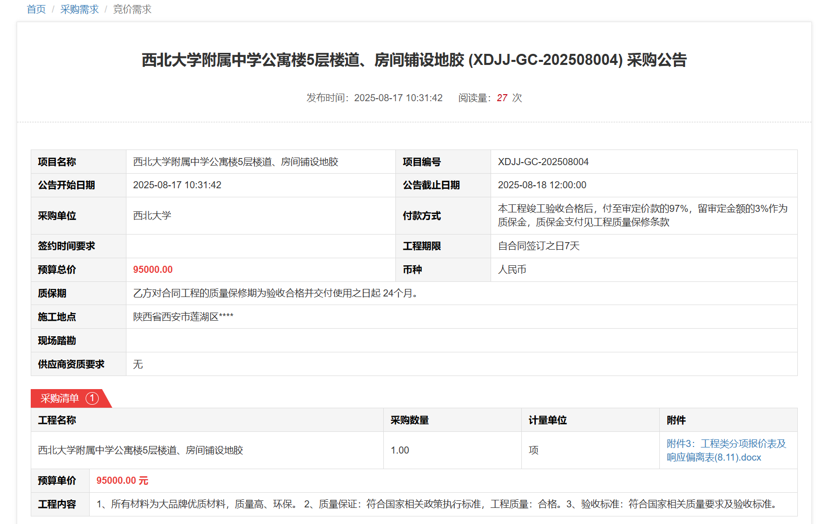 乐动网页版登录入口附属中学公寓楼5层楼道、房间铺设地胶(XDJJ-GC-202508004)竞价采购公告