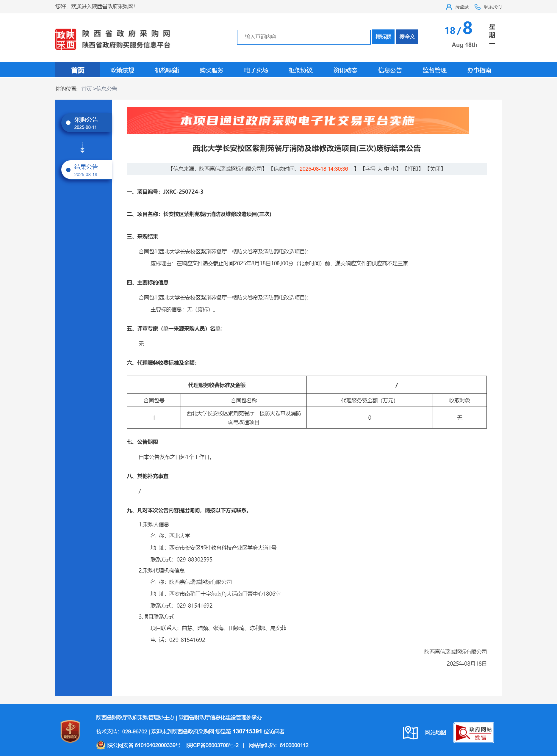 乐动网页版登录入口长安校区紫荆苑餐厅消防及维修改造项目(三次)废标结果公告