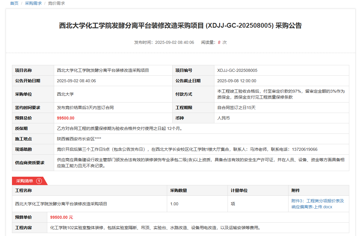 乐动网页版登录入口化工学院发酵分离平台装修改造采购项目(XDJJ-GC-202508005)竞价采购公告