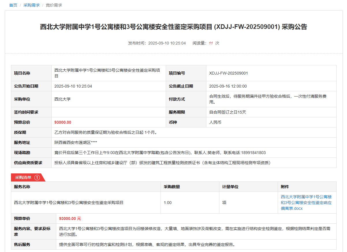 乐动网页版登录入口附属中学1号公寓楼和3号公寓楼安全性鉴定采购项目(XDJJ-FW-202509001)竞价采购公告