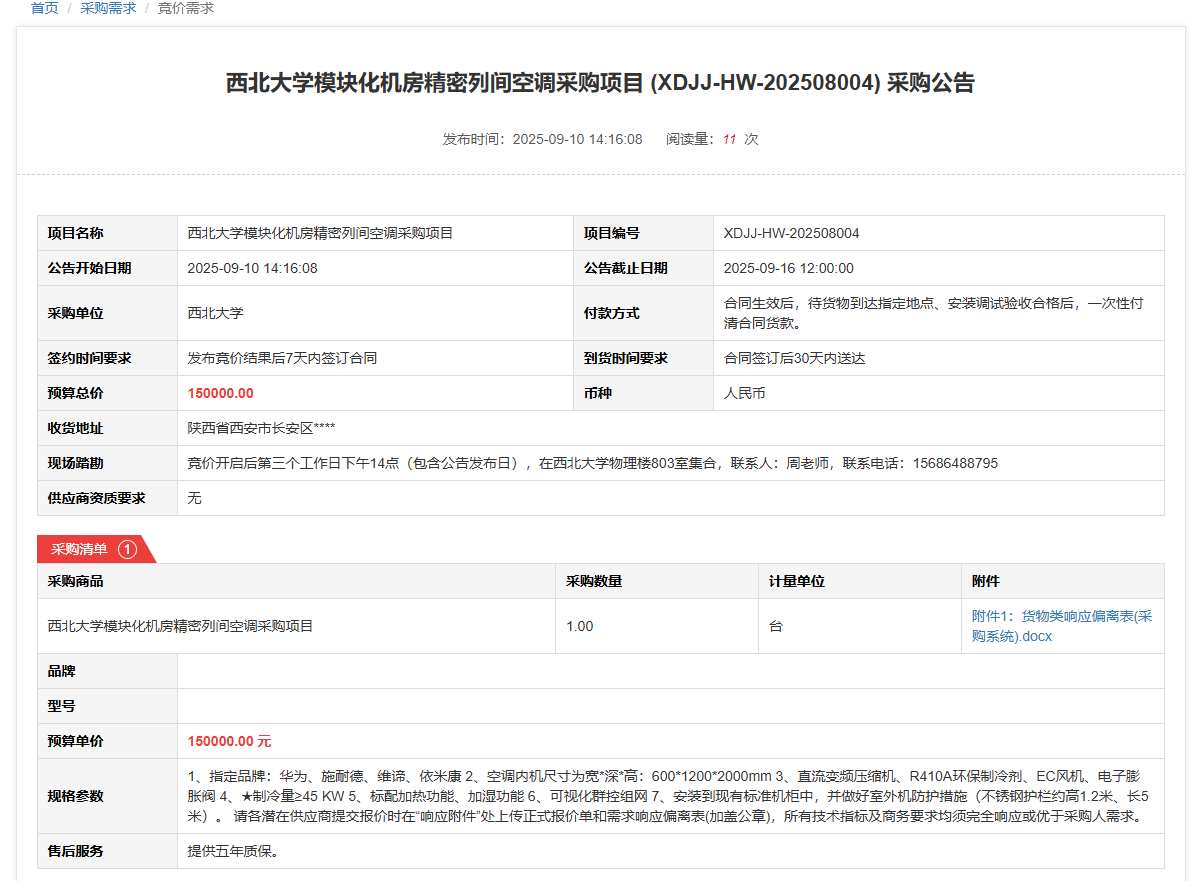 乐动网页版登录入口模块化机房精密列间空调采购项目(XDJJ-HW-202508004)竞价采购公告