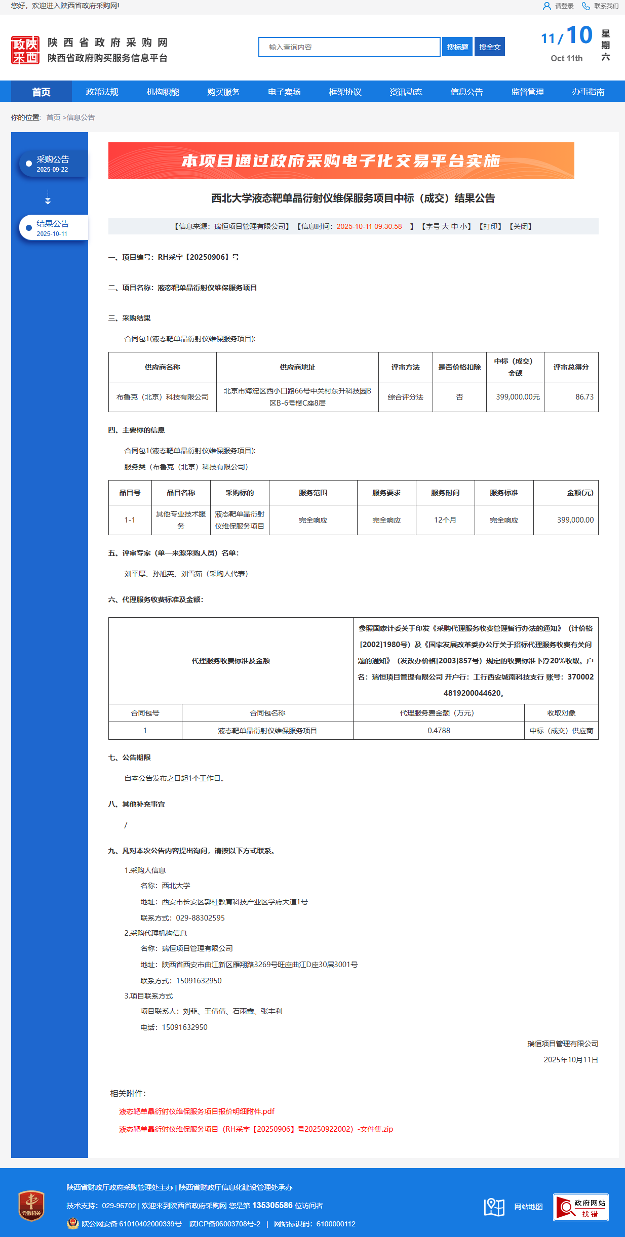 乐动网页版登录入口液态靶单晶衍射仪维保服务项目中标(成交)结果公告