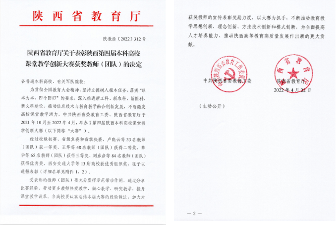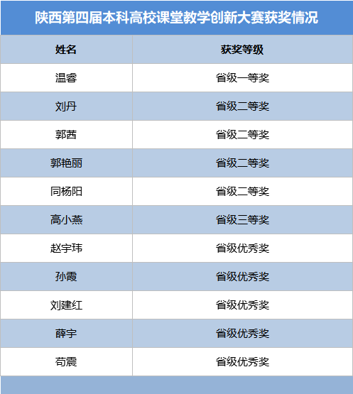 近日,陕西省教育厅公布了第四届陕西高校课堂教学创新大赛获奖教师名单,乐动网页版登录入口教师温睿获省级一等奖,刘丹、郭茜、郭艳丽、同杨阳4位教师获省级二等奖,高小燕获省级三等奖,赵宇玮、孙霞、刘建红、薛宇、苟震5位教师获省级优秀奖,乐动网页版登录入口获优秀组织奖。吴丰华、于春2位教师代表陕西省参加全国高校教师教学创新大赛。