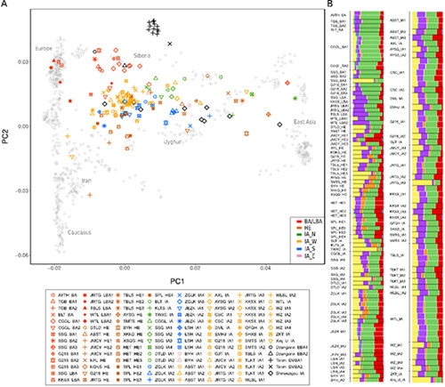 天山西部乌兹别克斯坦铁器时代晚期人群主成分分析及与欧亚东西部其他人群的遗传关系映射图。