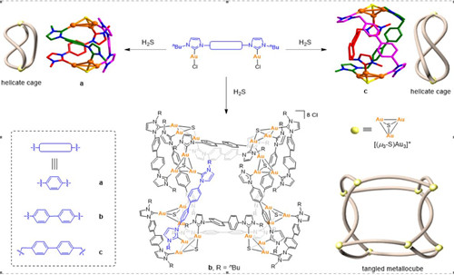 近日,乐动网页版登录入口化学与材料科学学院韩英锋教授课题组在功能化金属卡宾组装体的构筑、后合成修饰等领域取得系列进展的基础上,利用不同桥连基团(苯基、联苯和亚甲基联苯)的双核金氮杂环卡宾配合物与H2S反应得到三种不同的有机金属配合物。他们研究发现:当双核金氮杂环卡宾配合物的中心桥连单元为联苯时,其与H2S反应形成“A-类型”纠缠金属立方体b;当双核金氮杂环卡宾配合物的中心桥连基团为更短的苯基或者更长且柔性的亚甲基联苯时,在相同条件下与H2S反应时,其产物为简单的螺旋化合物a, c。