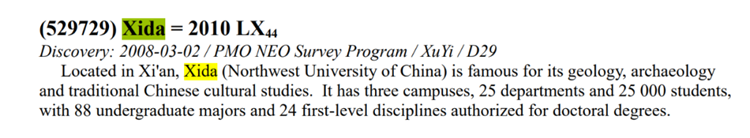 官方公告显示,“Xida”星由中国科学院紫金山天文台盱眙天文观测站2008年3月2日发现。“Xida”星是一颗主带小行星,位于太阳系火星与木星之间的小行星主带中,编号为529729,空间轨道根数(2000.0 黄道及春分点),吻切历元时刻2022年1月21日零时(历书时),轨道半长径为3.0444478天文单位,轨道偏心率0.0490849,轨道倾角6.59458度,升交点黄经295.32514度,近日点角距258.90803度,平近点角196.03646度,绕日运行周期5.3120579年。