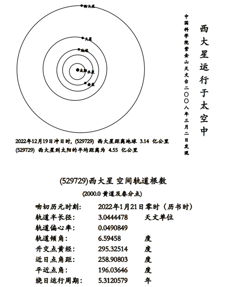 官方公告显示,“Xida”星由中国科学院紫金山天文台盱眙天文观测站2008年3月2日发现。“Xida”星是一颗主带小行星,位于太阳系火星与木星之间的小行星主带中,编号为529729,空间轨道根数(2000.0 黄道及春分点),吻切历元时刻2022年1月21日零时(历书时),轨道半长径为3.0444478天文单位,轨道偏心率0.0490849,轨道倾角6.59458度,升交点黄经295.32514度,近日点角距258.90803度,平近点角196.03646度,绕日运行周期5.3120579年。