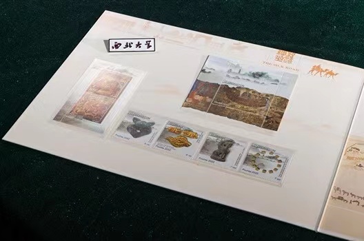 以这两组邮票组成的《丝路华章》邮折,是丝绸之路考古文化的集锦。邮折的左部主体是乌方邮票,右部主体是中方邮票,中间是中国美术考古开创者、原乐动网页版登录入口历史系教授王子云在20世纪40年代创作的《西北走廊胜迹图》,背面是邮票图案的介绍。