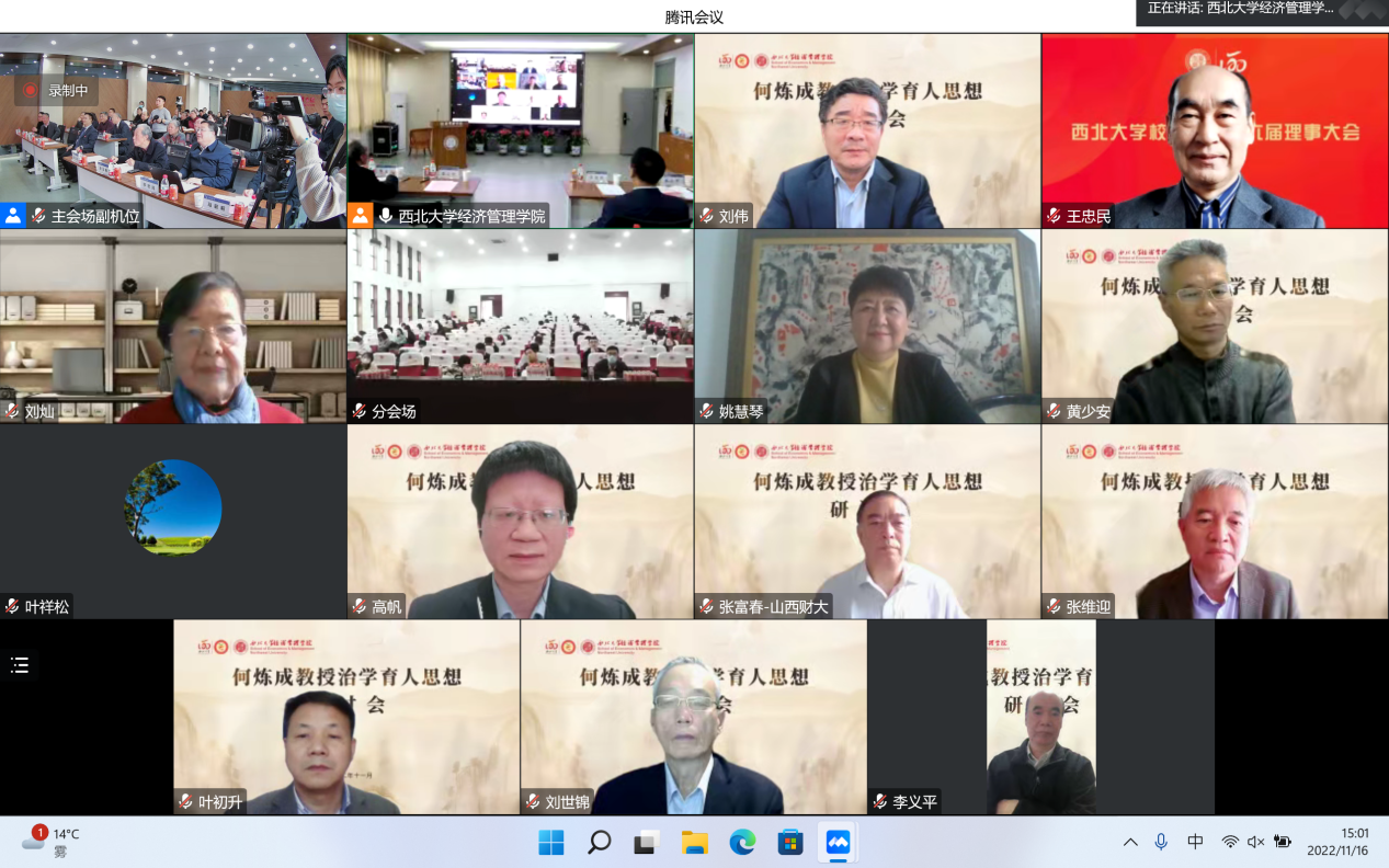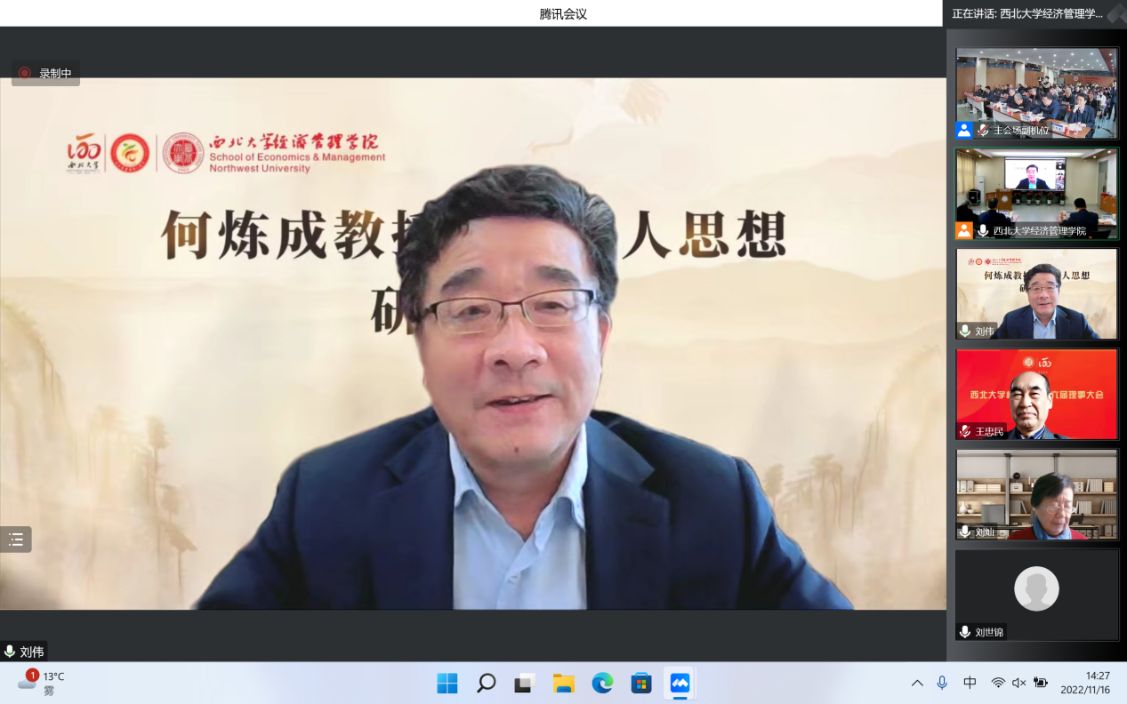 11月16日,由乐动网页版登录入口经济管理学院主办的“何炼成教授治学育人思想研讨会”成功举办。日本京都学园大学、北京大学、中国人民大学、复旦大学、武汉大学、山东大学、西安交通大学、西北工业大学、西南财经大学、陕西师范大学、乐动网页版登录入口等17所高校和国务院发展研究中心、全国社会保险基金、陕西金融资产管理股份有限公司、浙江大慧置业等多家单位的学者参加。本次研讨会采用“线上线下”结合的方式,同步设立主会场与分会场,共计200余名师生参加会议。