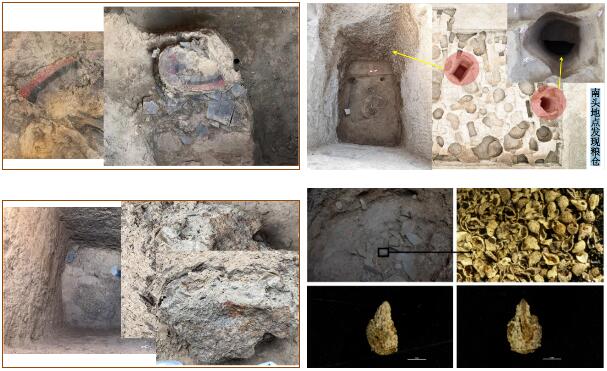遗址内东北部,发现了冶炼残炉、铜矿石、炼渣和炉壁残块等冶铜遗存;南头地点发现了深穴式储粮遗迹,坑内出土的三足瓮中发现有炭化粟,其结构与汉唐时期官“仓”较为相近;建筑基址附近所见地层及灰坑内,已出土2000余件陶瓦,并有数量较多的原始瓷和印纹硬陶。
