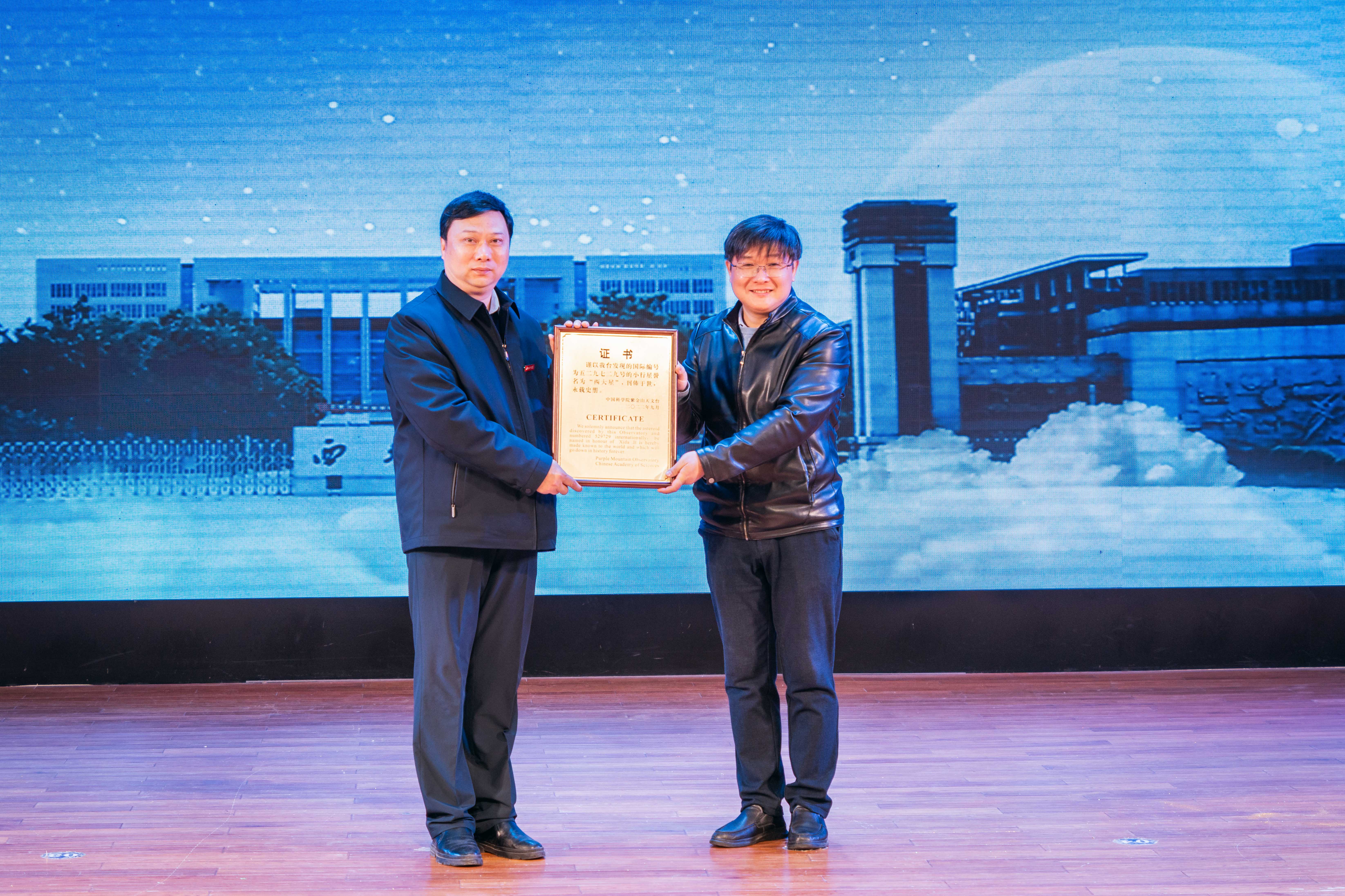 吴雪峰向乐动网页版登录入口赠送“Xida”星证书、命名公报,赖绍聪、张远军代表学校接受相关资料。
