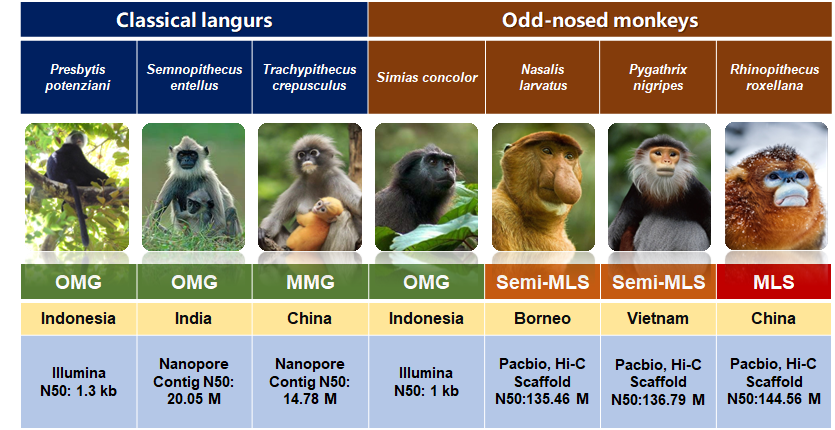 为了解答这个疑惑,团队开创性地建立了“行为-生态-基因组”这一全新的研究范式。他们克服跨学科、跨地域等重重困难,完成了亚洲叶猴七个属代表物种的高质量全基因组测序,得到了全球首个染色体级别的非人灵长类基因组,从而构建精确的系统发育关系。“我们把宏观进化生物学与微观分子生物学的中心法则相结合,来挖掘寒冷事件驱动社群聚集背后的遗传学机制。”齐晓光说。