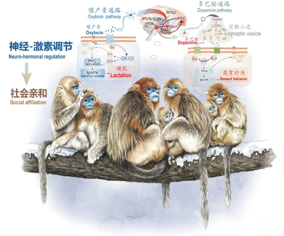 “在哺乳动物中,催产素和多巴胺具有强化母亲与幼儿之间的纽带的作用。寒冷效应引发它们的适应性变化,强化了母婴间的纽带,延长了寒冷地区奇鼻猴的亲本抚育。同时,个体间的友好行为也得到促进,进而推动了单家庭群向重层社会的聚集。”齐晓光介绍。这一结果还得到了细胞功能实验和行为学实验的验证。
