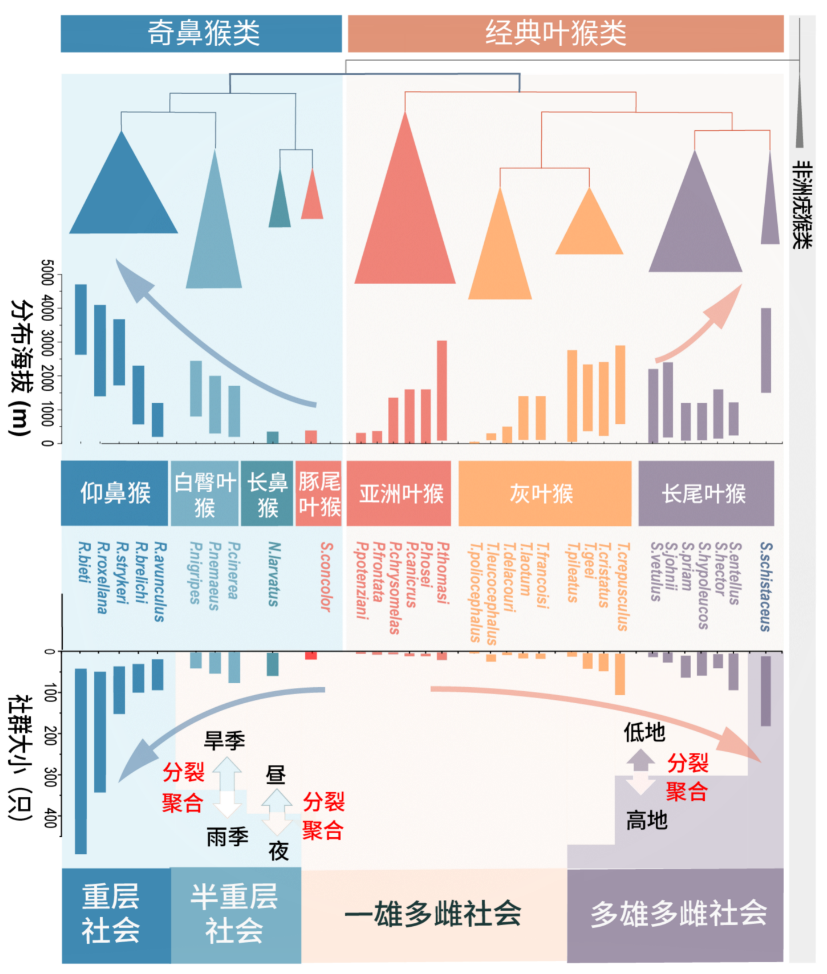 大约800万年前的中新世,亚洲叶猴的祖先从欧洲扩散而来。其中一支,从印度半岛扩散到了东南亚地区,这一类群分化成三个属,并保留了祖先的一雄多雌制“单家庭群”社会系统。而另一支在晚中新世扩散到了中国云南,形成了奇鼻猴的基部类群。伴随着这一地区晚中新世的寒冷事件,它们的家庭群不再互相排斥,时而分离,时而聚合,形成了类重层社会。由于食物匮乏,大多数奇鼻猴后来向南扩散,演化出白臀叶猴和长鼻猴等不同物种。时至今日,尽管它们生活在越南和加里曼丹岛的温暖地区,却仍然保留着类重层社会这一结构特征。但与此同时,留在中国北方的近亲金丝猴,却在更新世反复的冰期与间冰期的一次次寒冷事件中,拉近了社会关系,培养出家庭间长期、稳定的纽带联系,演化出了真正的重层社会。