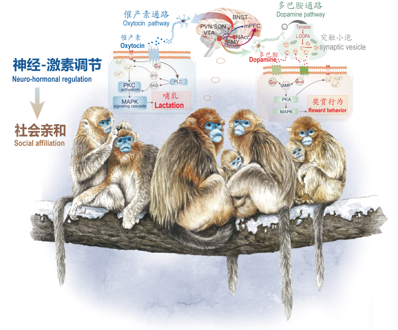 “在哺乳动物中,催产素和多巴胺具有强化母亲与幼儿之间的纽带的作用。寒冷效应引发它们的适应性变化,强化了母婴间的纽带,延长了寒冷地区奇鼻猴的亲本抚育。同时,个体间的友好行为也得到促进,进而推动了单家庭群向重层社会的聚集。”齐晓光介绍。这一结果还得到了细胞功能实验和行为学实验的验证。