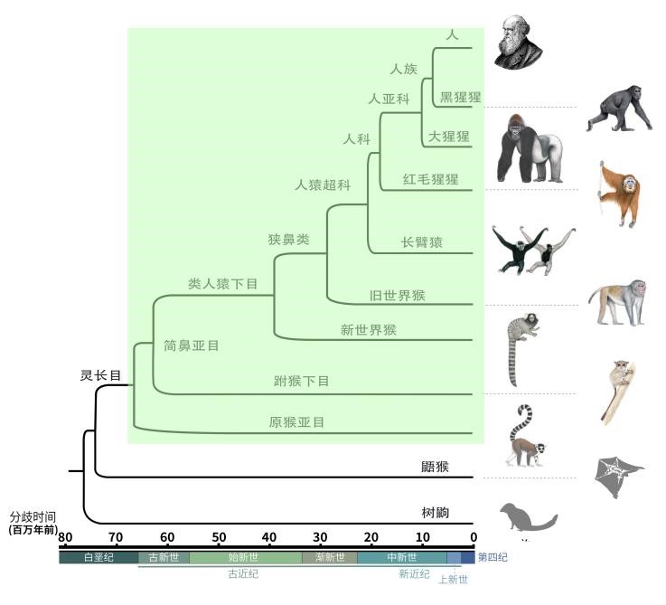 灵长目演化树。图片由Stephen D. Nash绘制,张国捷课题组和吴东东课题组合作供图