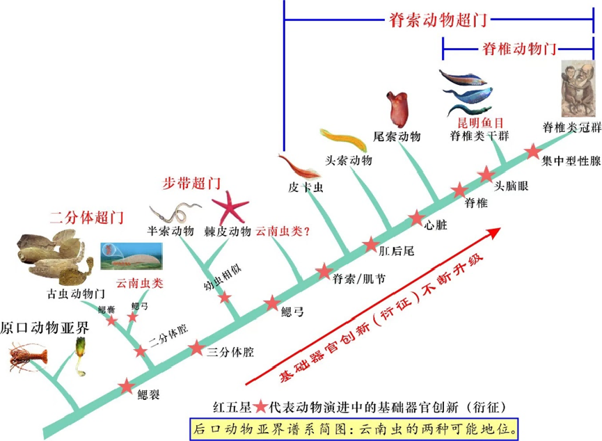 中科院院士、乐动网页版登录入口地质学系教授舒德干介绍,“在后口亚界谱系演进上,云南虫比脊椎动物至少低4个基础器官创新(衍征)等级(见上图)。目前脊椎动物已知唯一的干群是昆明鱼目,因为它已具有头脑眼、单鼻孔和嗅囊、原始脊椎、二分心脏、复杂肌节等无颌鱼必需的基本器官构造,所以与脊椎动物冠群的亲缘关系密切。”