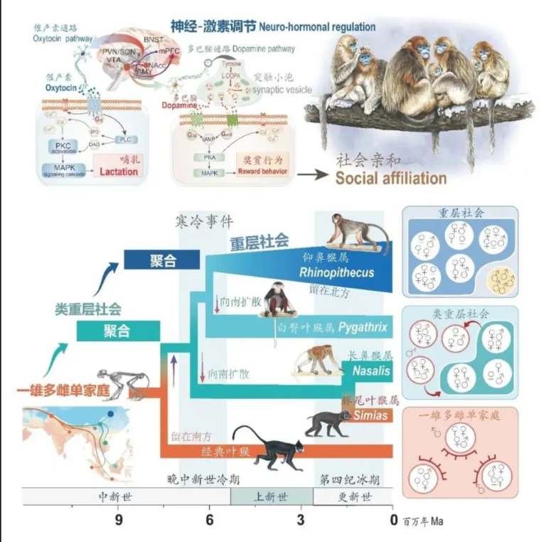 灵长类如何演化出多样的社会?我校金丝猴研究团队整合行为学、生态学、基因组学等多学科手段,设计出“社会-生态-基因组”全新研究范式。通过化石、古环境及现生生态等大数据挖掘,发现历史寒冷可能驱动社群聚集。进一步地,比较基因组学,细胞功能实验和行为学分析揭示寒冷效应引发催产素和多巴胺等脑、神经激素系统适应性遗传变异,间接增加个体友好行为及容忍度,促进单家庭群向重层社会聚集,从而系统回答灵长类社会演化之谜。