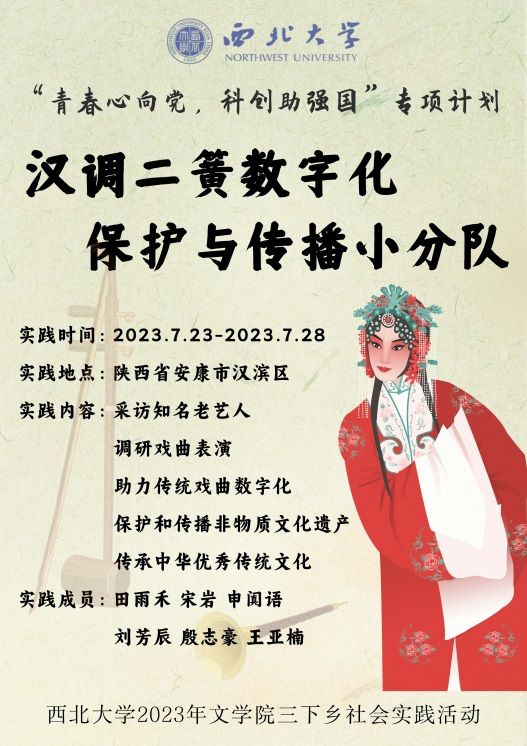 7月23日至28日,乐动网页版登录入口文学院2021级广播电视编导专业学生组成的“汉调二簧数字化保护与传播小分队”前往陕西省安康市汉滨区开展暑期文化科技卫生“三下乡”社会实践活动。