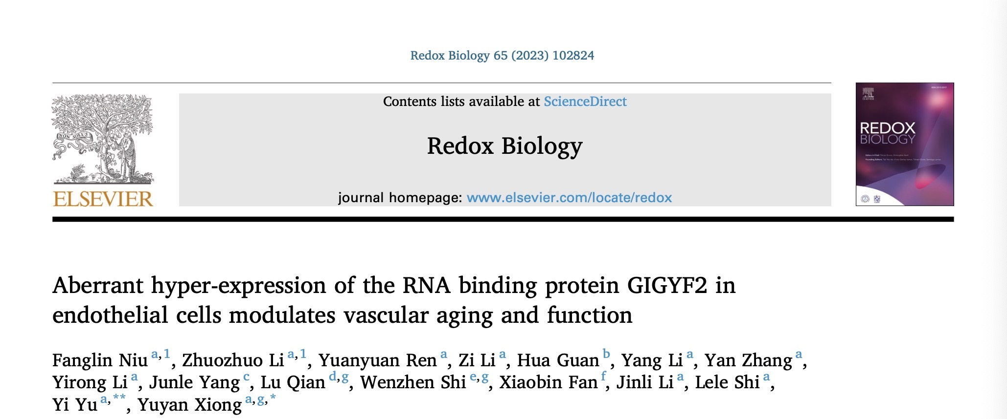 近日,乐动网页版登录入口生命科学与医学部熊裕焱教授团队在GIGYF2在血管内皮细胞衰老中的生物功能及其调控机制的研究中取得了新进展,研究结果发表在Redox Biology,题为“Aberrant hyper-expression of the RNA binding protein GIGYF2 in endothelial cells modulates vascular aging and function”。