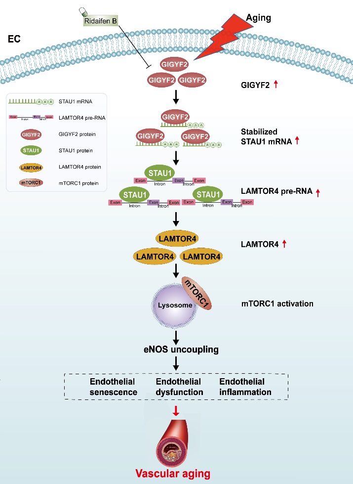 GIGYF2与衰老相关疾病的发病机制密切相关。该研究发现GIGYF2在衰老的人ECs和老年小鼠主动脉中异常高表达;在非衰老ECs中,过表达GIGYF2会促进eNOS解偶联、细胞衰老、内皮功能障碍和mTORC1-SK61信号通路的激活,而雷帕霉素或抗氧化剂N-乙酰-L-半胱氨酸处理可抑制这一现象;剥夺STAU1能明显缓解GIGYF2诱导的年轻ECs衰老、功能障碍和炎症;GIGYF2作为一种RNA结合蛋白可增强STAU1 mRNA的稳定性,而且GIGYF2-STAU1信号轴通过上调LAMTOR4表达促进mTORC1转位至溶酶体,从而驱动mTORC1-S6K1通路的激活;此外,在小鼠模型中,GIGYF2flox/flox Cdh-Cre+小鼠保护老年小鼠免受衰老相关的血管内皮依赖性舒张和动脉僵硬的影响。破坏GIGYF2-STAU1-mTORC1信号级联可能是应对血管衰老和衰老相关心血管疾病的一种有前景的治疗方法。