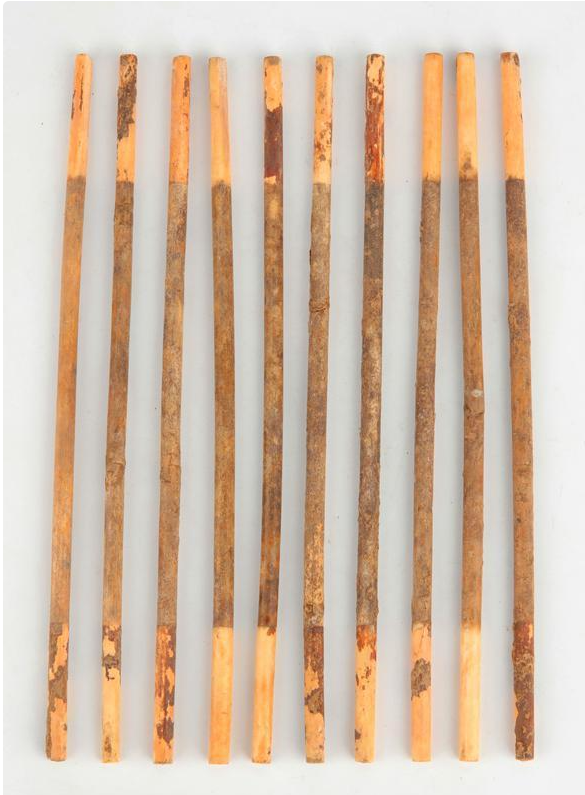 象牙算筹出土于神禾原战国秦陵园,位于陕西省西安市长安区南郊,2004~2008年间,陕西省考古研究院在此进行了四年的发掘工作,揭露了一座由亚字形大墓、兆沟、垣墙、从葬坑、建筑基址等构成的大型战国秦陵园遗址。陵墓虽遭严重的盗掘,但仍出土了较多重要文物,其中在直通大墓椁室的早期盗洞内发现一批制作精良的象牙算筹,筹身涂饰以红、黑色彩,此类形制未见于以往的考古发现及文献记载。