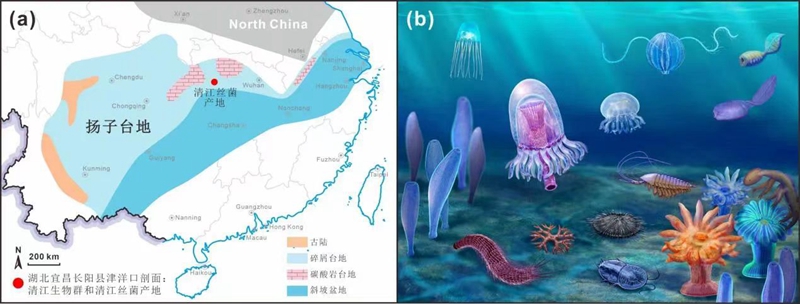 清江丝菌化石的产地和环境背景。(a)早寒武纪扬子台地岩相古地理图和清江丝菌及所属清江生物群的化石产地;(b)清江生物群生态复原图 乐动网页版登录入口供图