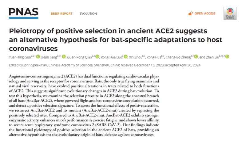 研究表明,自然选择对蝙蝠祖先血管紧张素转化酶两种功能造成了影响,提示着蝙蝠的飞行演化与抗冠状病毒之间的协同演化关系,该结果为“蝙蝠如何进化出防御冠状病毒的机制”提供了新的理解。