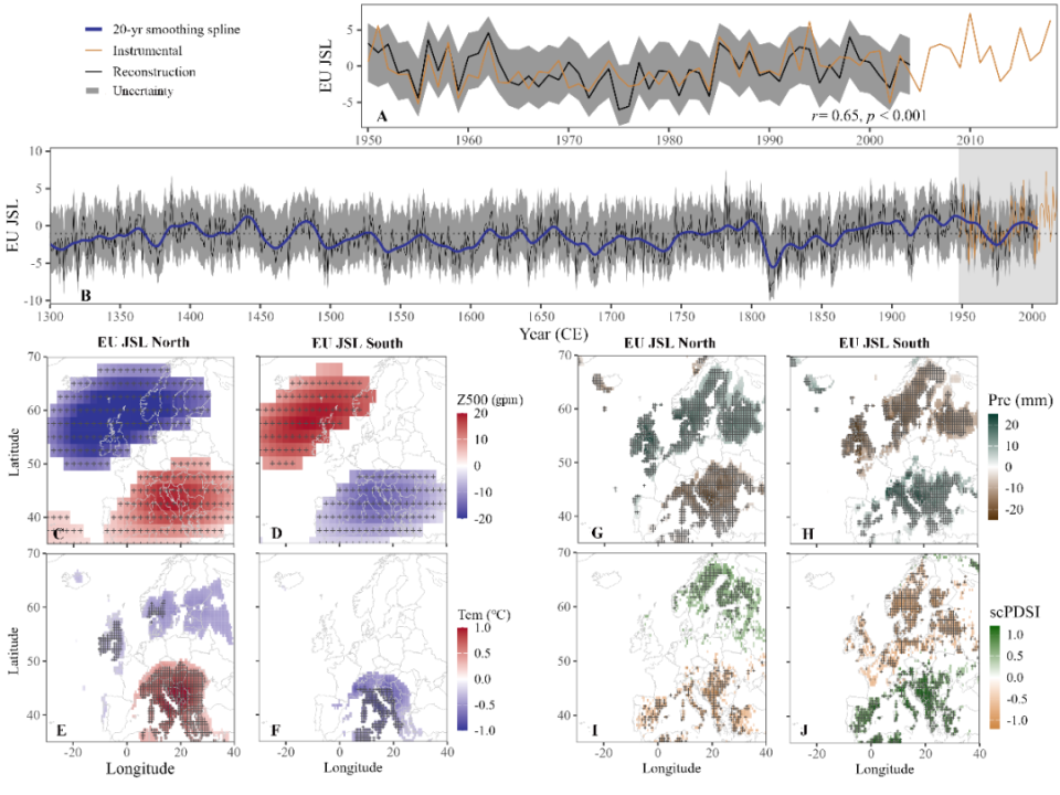 图:欧洲急流纬度(EU JSL)夏季气候“偶极”模态重建和极端年份合成分析。急流纬度位置器测时段(A)和重建时段(B).气候要素在重建的极端急流年份合成分析;500 hP位势高度(C,D);夏季气温(E, F);夏季降水(G, H);夏季干旱指数(scPDSI;I, J).。
