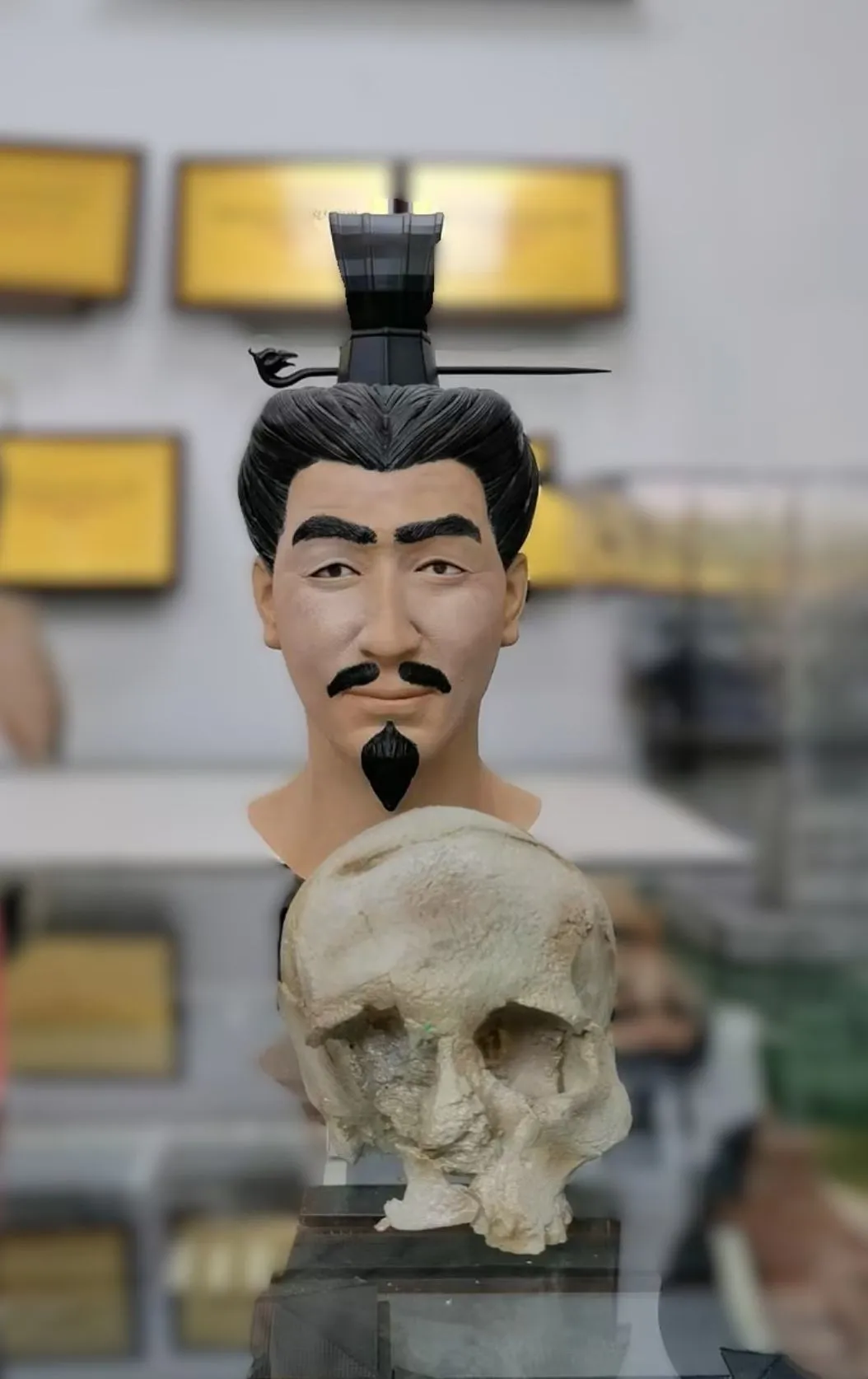 疑似秦始皇的王子与嫔妃的3D打印颅面复原模型和3D打印颅骨模型,被标注为“秦男秦女颅骨面貌复原”,与李倕的3D打印颅面复原模型及颅骨模型一起放在研究中心会议室的玻璃展柜上。疑似王子长脸、细目、高鼻;疑似嫔妃有一双大眼睛,鼻子长而高。