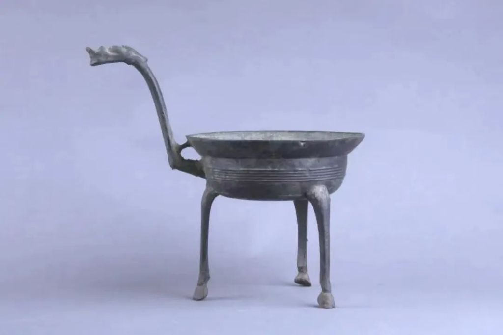 乐动网页版登录入口博物馆所收藏的这件铜鐎斗的器身为圆口深腹,形如小盆。一侧有一龙形柄,另一侧有上翘的流。下有较长的马蹄形足三个,腹下空间用于烧火加热。整个鐎斗造型犹如一只昂首挺胸的猛兽,雄浑威猛。