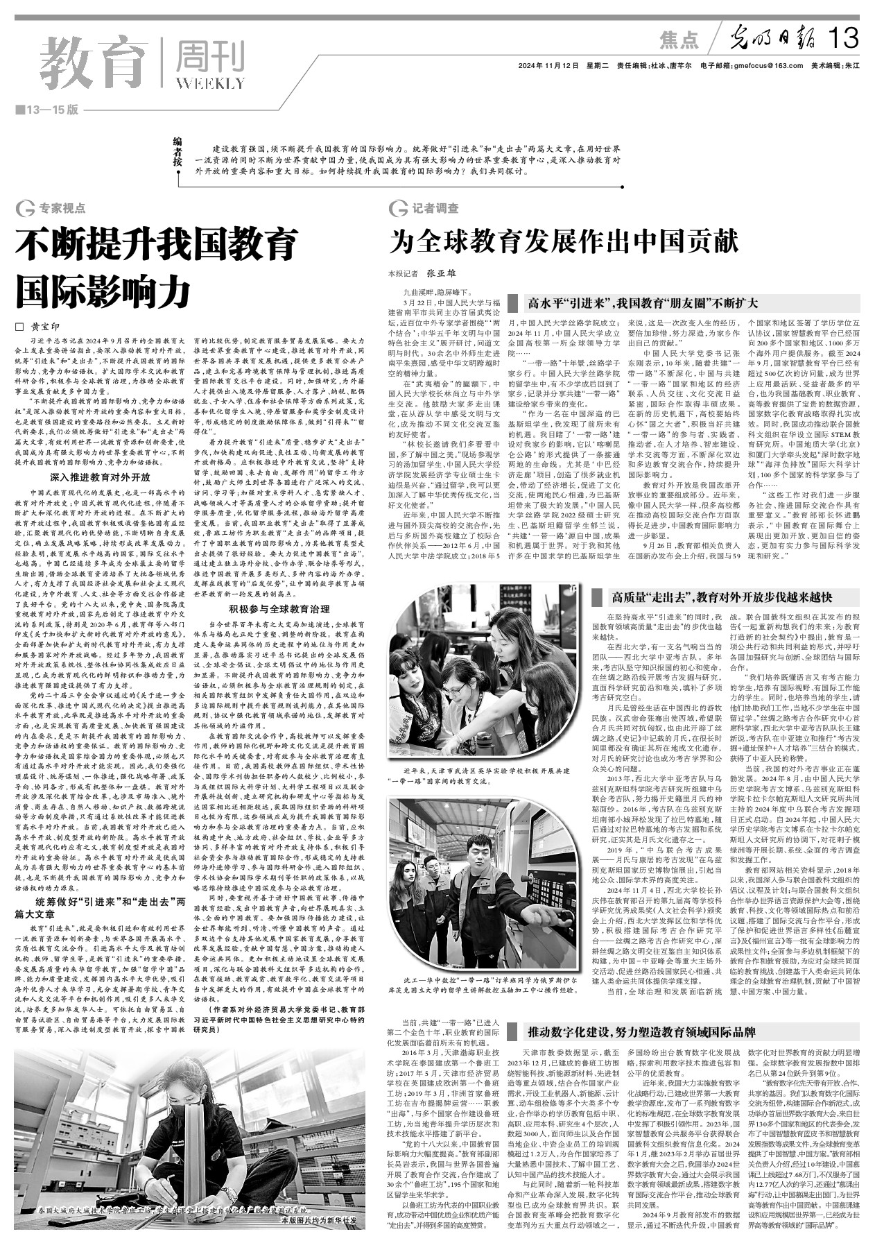 9月26日,教育部相关负责人在国新办发布会上介绍,我国与59个国家和地区签署了学历学位互认协议,国家智慧教育平台已经面向200多个国家和地区、1000多万个海外用户提供服务。截至2024年9月,国家智慧教育平台已经有超过500亿次的访问量,成为世界上应用最活跃、受益者最多的平台,也为我国基础教育、职业教育、高等教育提供了宝贵的数据资源,国家数字化教育战略取得扎实成效。同时,我国成功推动联合国教科文组织在华设立国际STEM教育研究所。中国地质大学(北京)和厦门大学牵头发起“深时数字地球”“海洋负排放”国际大科学计划,100多个国家的科学家参与了合作……