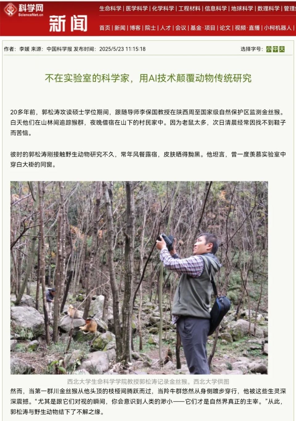2018年,郭松涛联合乐动网页版登录入口信息科学与技术学院,和西安电子科技大学跨学科攻关,开始研发专注于动物行为研究的人工智能技术;2020年,团队基于长期积累的金丝猴特征数据,创新性提出具有关注机制的深度神经网络模型,成功研发出全球首个金丝猴个体识别系统(Tri-AI)。